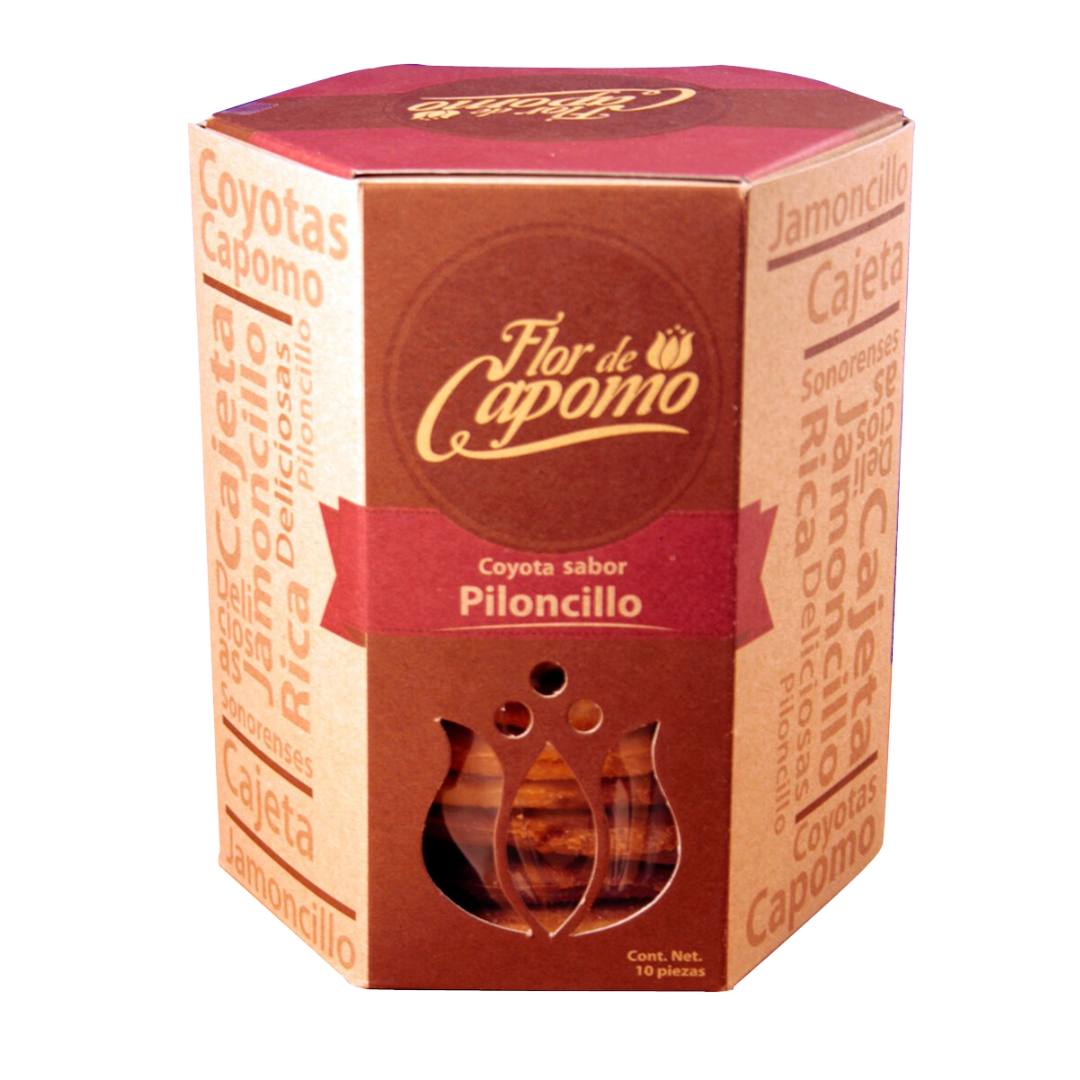 Postre tradicional Sonorense horneado suave con relleno de piloncilo, ligeramente espolvoreadas de azúcar en su presentación con 10 pzs en caja.