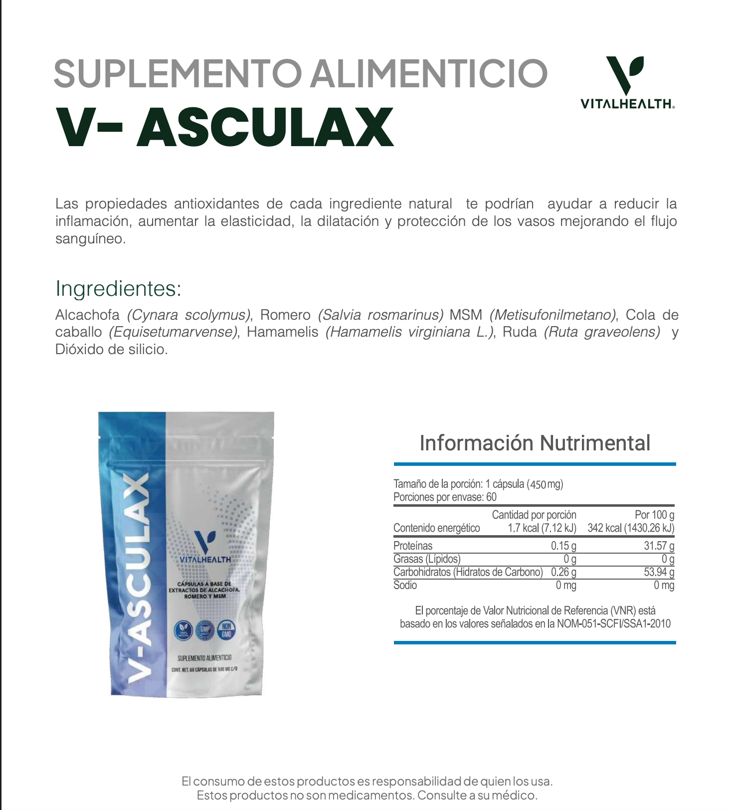 V-ASCULAX es un suplemento en cápsulas formulado con alcachofa, romero y MSM (Metilsulfonilmetano), ingredientes naturales que favorecen la circulación sanguínea, reducen la inflamación y mejoran la elasticidad de los vasos sanguíneos. Su fórmula está diseñada para quienes buscan un corazón saludable y un mejor flujo sanguíneo.