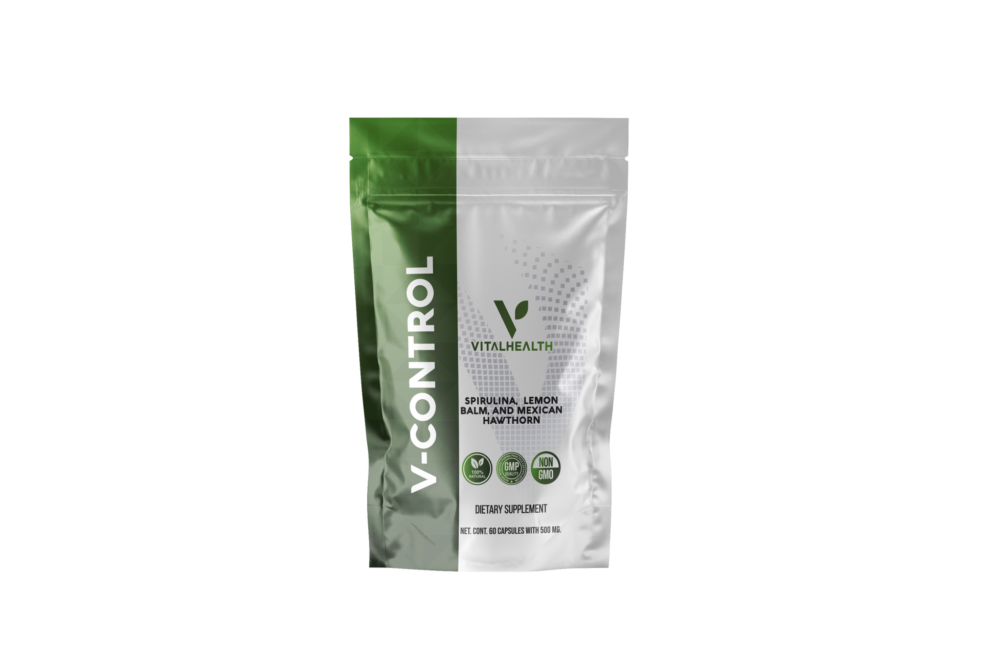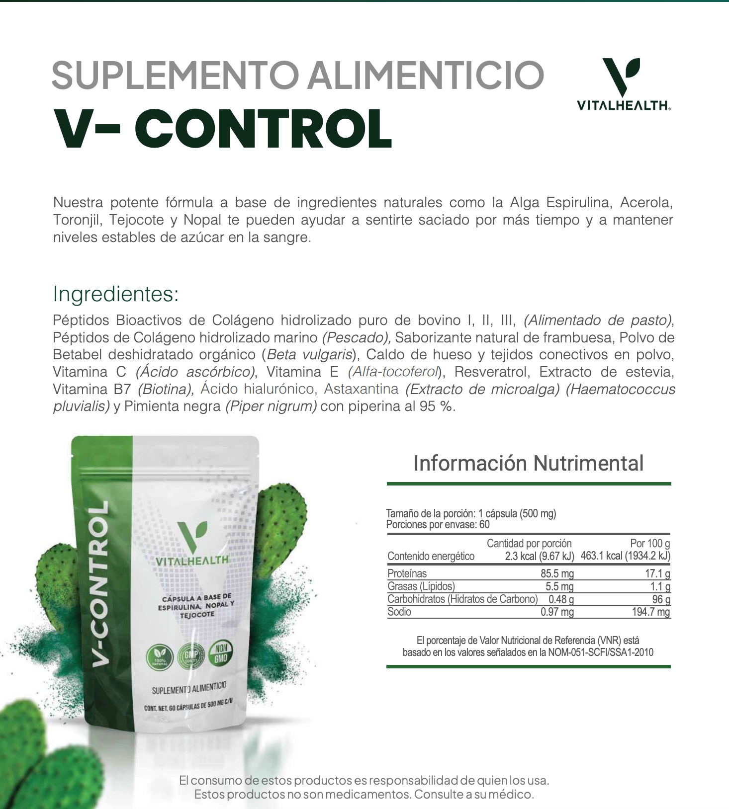 V-CONTROL es un suplemento en cápsulas formulado con espirulina, acerola, toronjil, tejocote y nopal, ingredientes naturales que favorecen el control del apetito, estabilizan los niveles de azúcar en la sangre y apoyan la digestión.