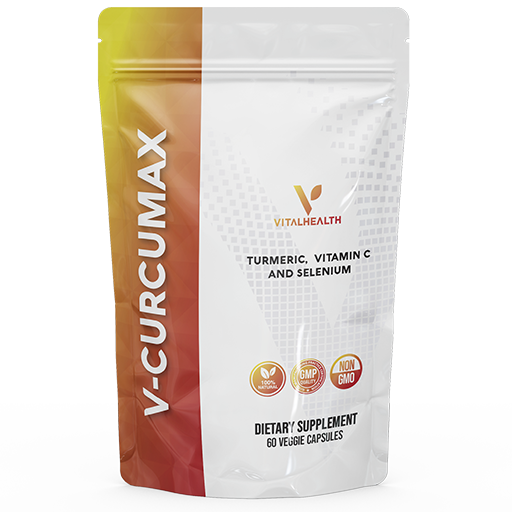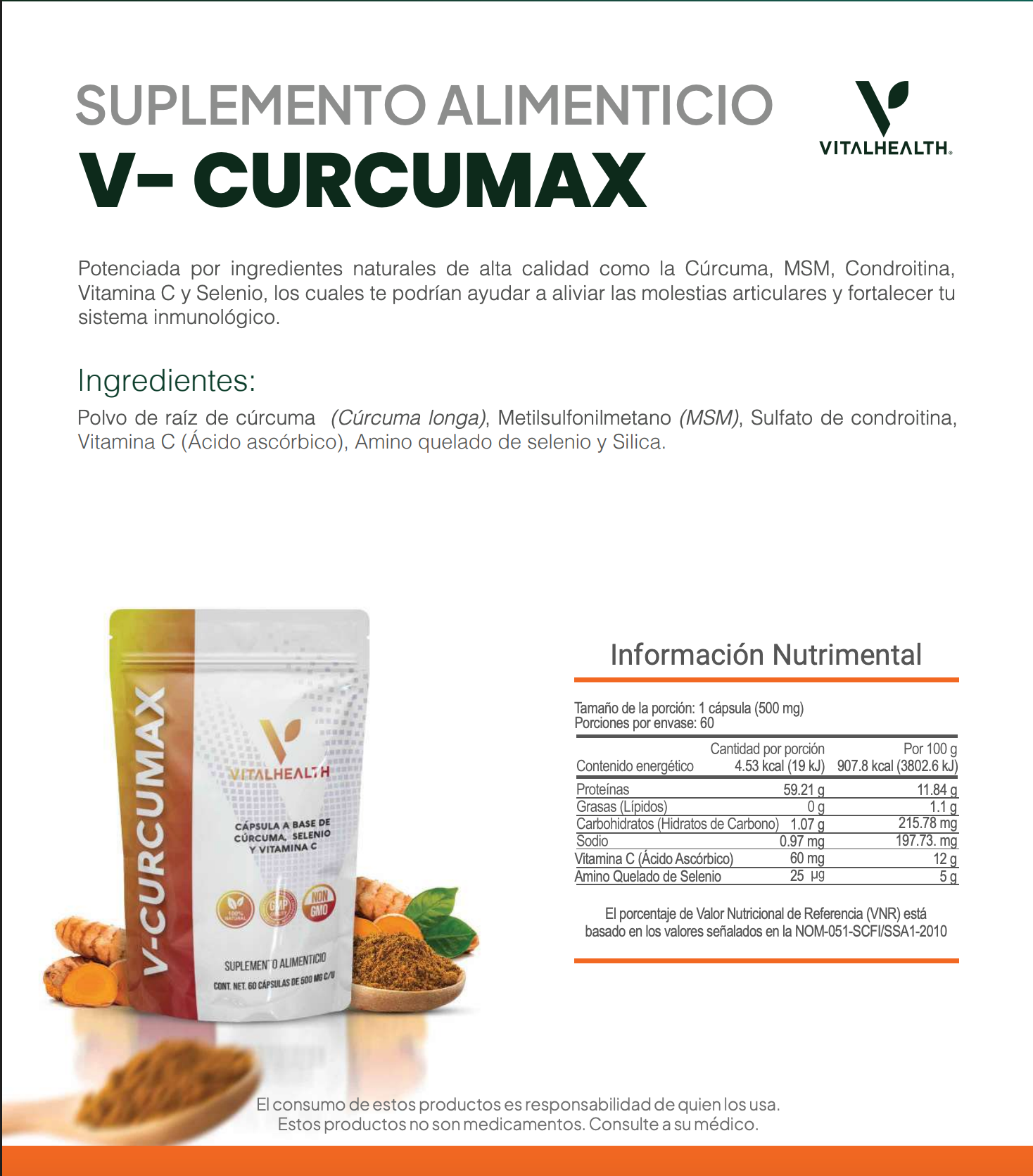 V-CURCUMAX es un suplemento en cápsulas formulado con cúrcuma, MSM, condroitina, vitamina C y selenio, diseñado para aliviar molestias articulares, reducir la inflamación y fortalecer las defensas naturales del cuerpo.