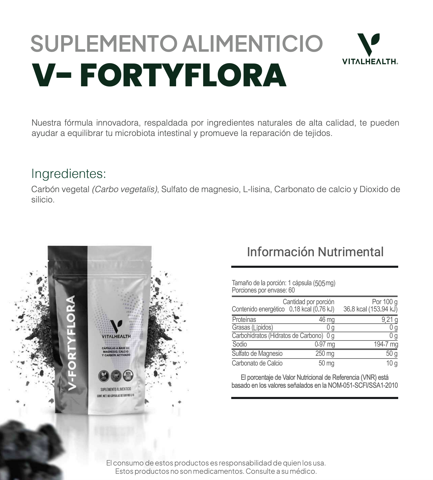 V-FORTYFLORA es un suplemento en cápsulas formulado con ingredientes naturales para equilibrar la microbiota intestinal, mejorar la digestión y fortalecer el sistema inmunológico. Su fórmula avanzada apoya la reparación de los tejidos intestinales y favorece la absorción de nutrientes esenciales.