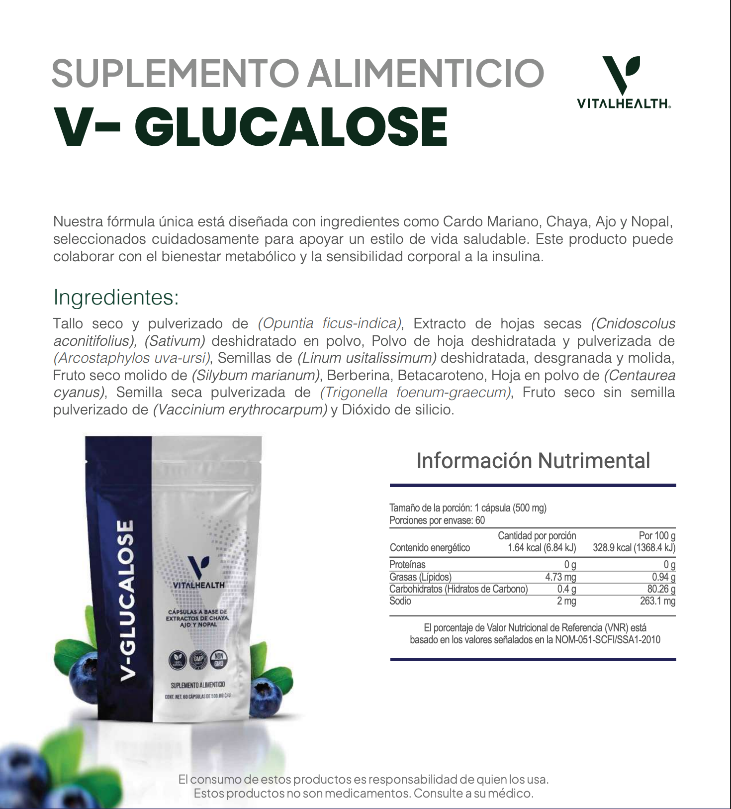 V-GLUCALOSE es un suplemento en cápsulas formulado con ingredientes naturales como cardo mariano, chaya, ajo y nopal, conocidos por su capacidad para apoyar el metabolismo, mejorar la sensibilidad a la insulina y favorecer el bienestar general.
