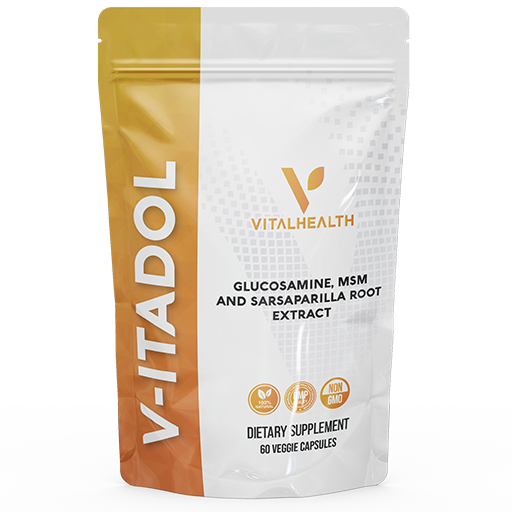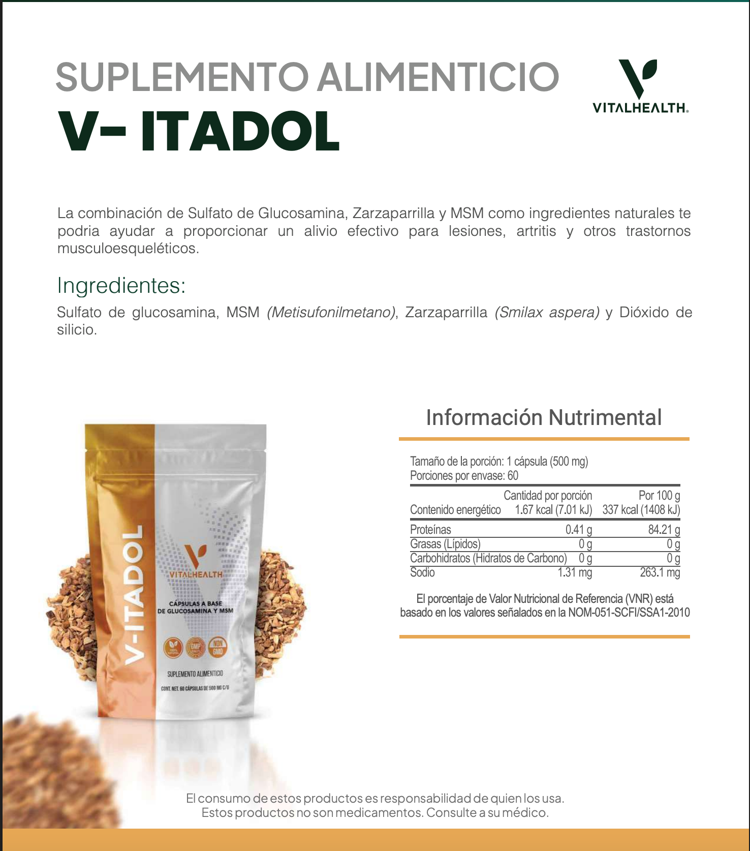 V-ITADOL es un suplemento en cápsulas formulado con sulfato de glucosamina, MSM y zarzaparrilla, diseñado para aliviar molestias musculoesqueléticas, mejorar la movilidad y promover la regeneración del cartílago.