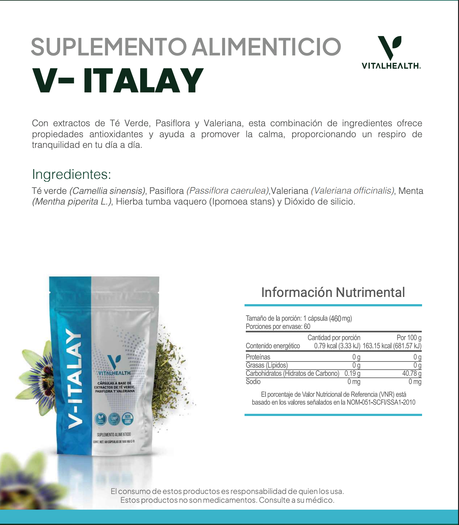 Disfruta de momentos de tranquilidad con V-ITALAY, un suplemento alimenticio diseñado para promover la calma y combatir el estrés del dÃa a dÃa. Con una fórmula rica en extractos naturales como té verde, pasiflora y valeriana, este producto combina propiedades antioxidantes con efectos relajantes, ideales para apoyar tu salud mental y emocional.