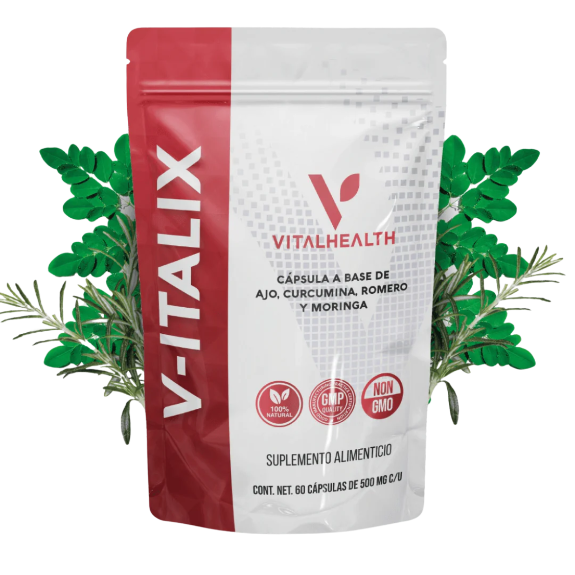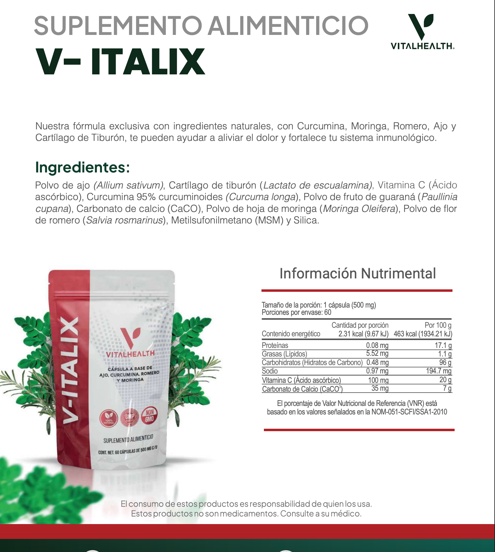 V-ITALIX es un suplemento en cápsulas formulado con curcumina, moringa, romero, ajo y cartílago de tiburón, diseñado para reducir la inflamación, aliviar molestias musculares y articulares, fortalecer el sistema inmunológico y aumentar la vitalidad.