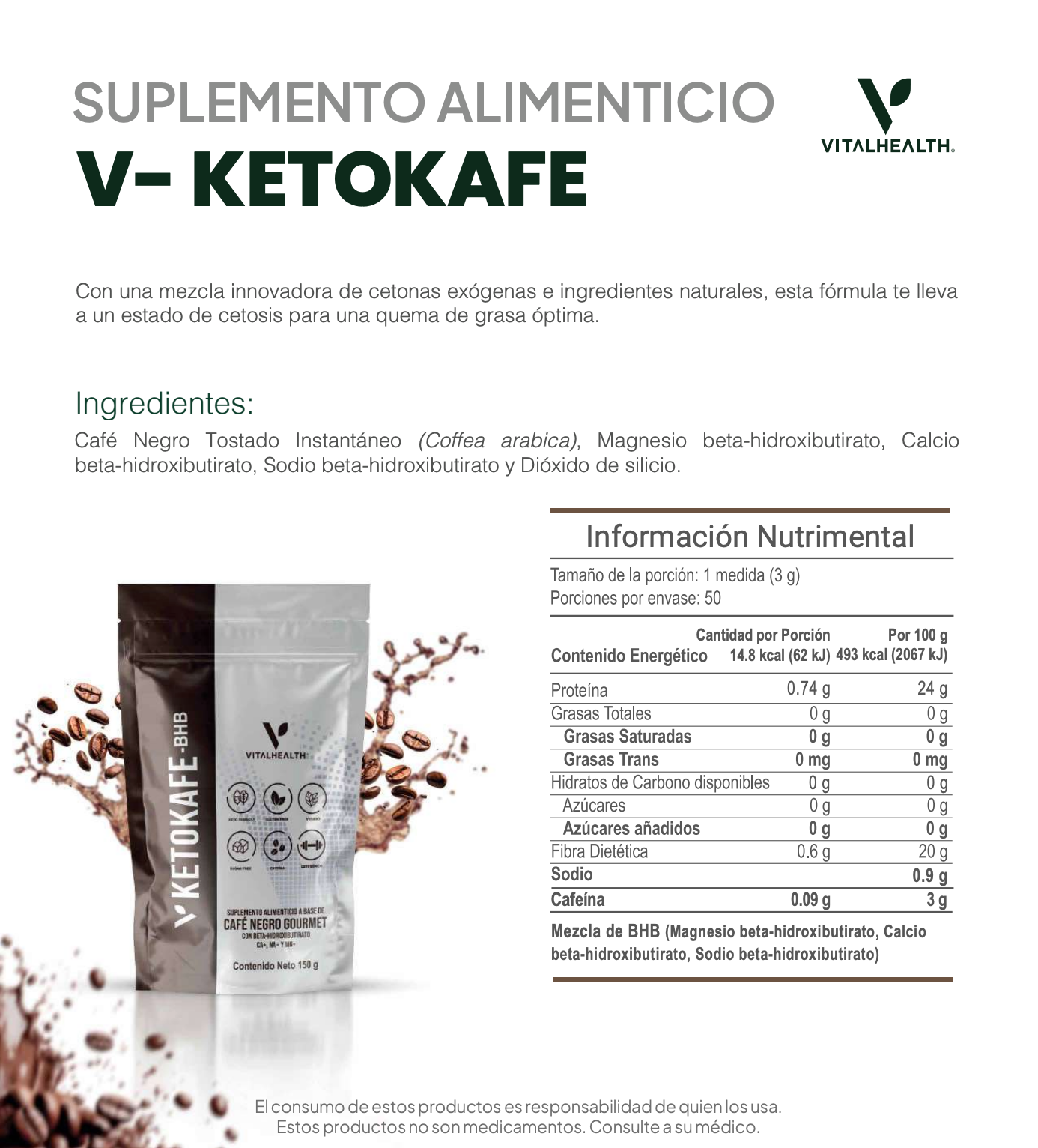 V-KETOKAFE es una mezcla innovadora de café negro tostado y cetonas exógenas, diseñada para apoyar la cetosis, mejorar la energía y optimizar la quema de grasa. Ideal para quienes siguen una dieta cetogénica y buscan un impulso natural para el rendimiento físico y mental.