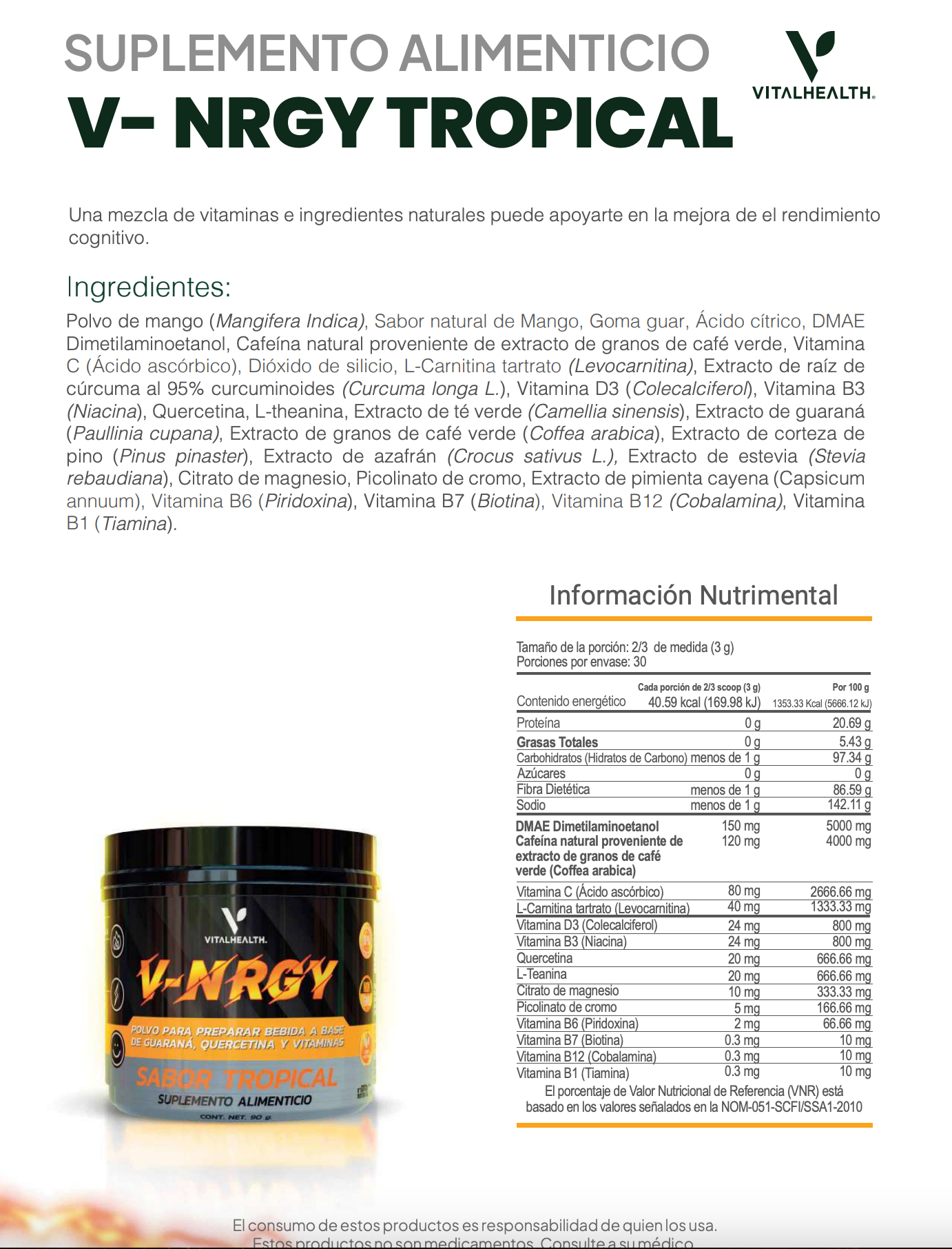 V-NRGY Tropical es un suplemento en polvo formulado con mango, café verde, L-Carnitina y cúrcuma, diseñado para proporcionar energía sostenida, mejorar la concentración y apoyar el metabolismo. Su refrescante sabor tropical lo hace ideal para empezar el día con vitalidad.