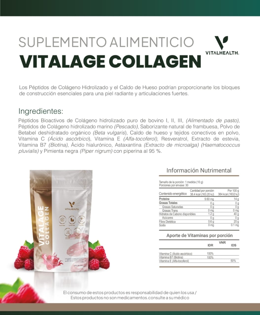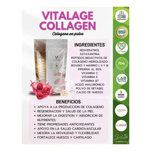Descubre VITALAGE COLLAGEN, una fórmula premium con péptidos bioactivos de colágeno hidrolizado de fuentes bovinas y marinas, diseñada para apoyar la salud de la piel, cabello, uñas, articulaciones y bienestar general.