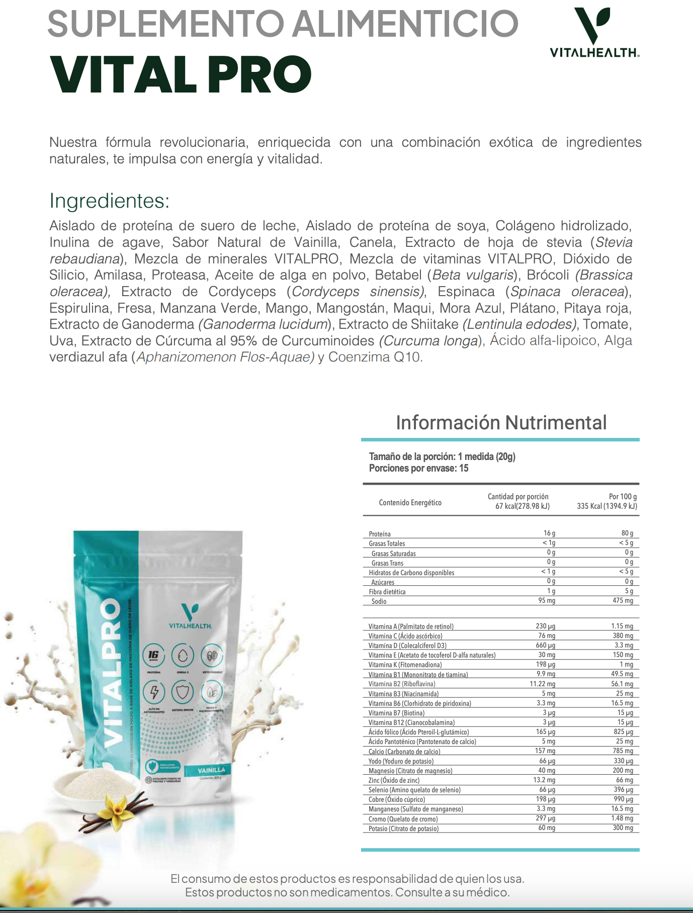 VITAL PRO es un suplemento en polvo diseñado para proporcionar energía sostenida, fortalecer el sistema inmunológico y apoyar la recuperación muscular. Su fórmula combina proteínas de alta calidad, superalimentos, vitaminas y antioxidantes para un bienestar integral.